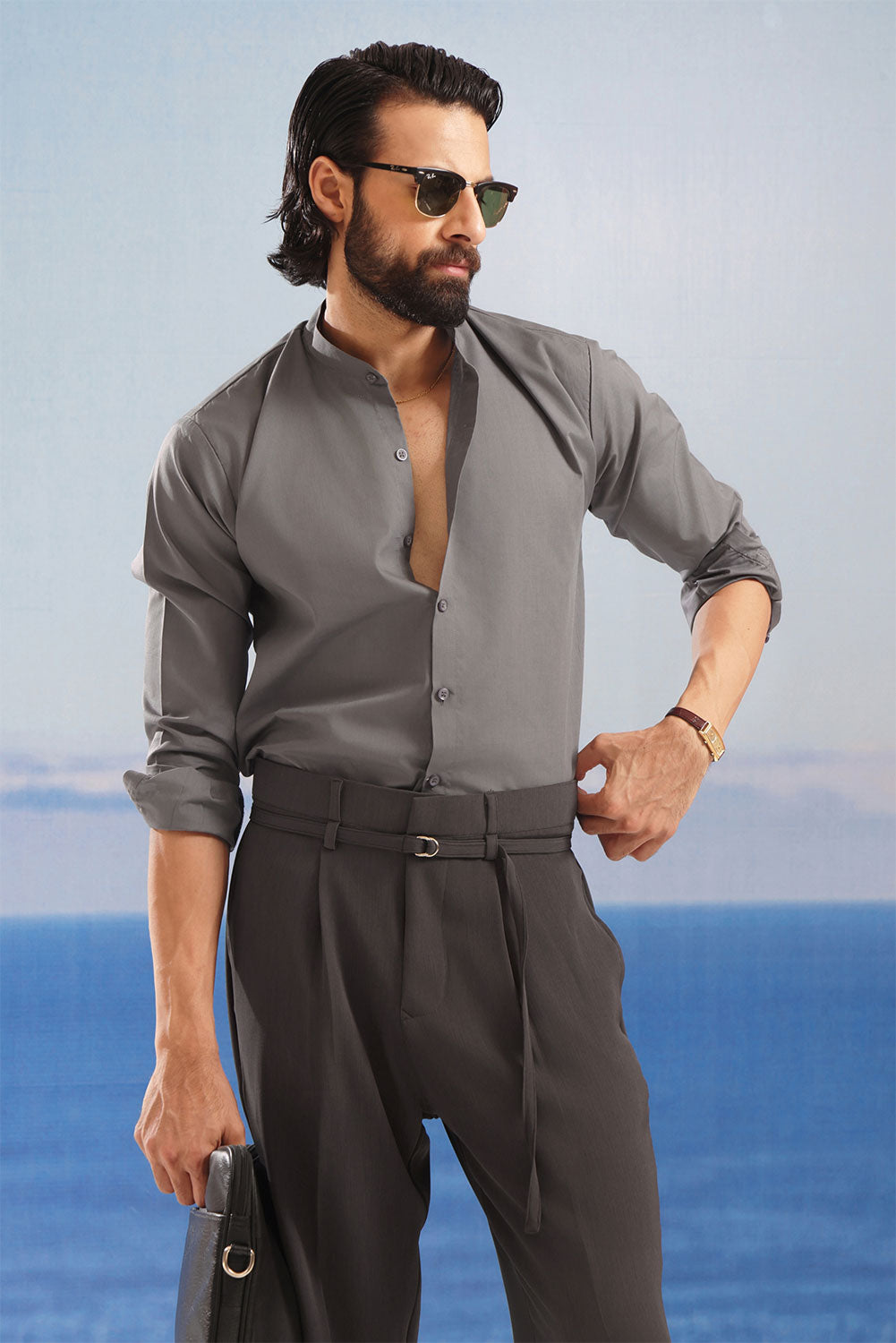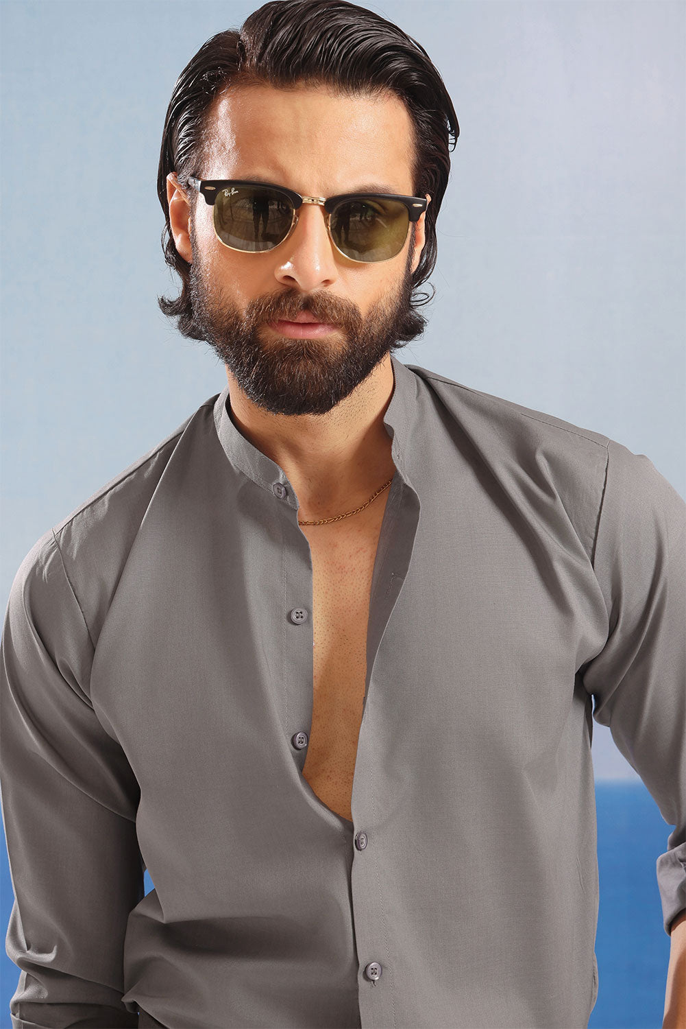 Dark Grey Cotton With Stand-Up Collar Shirt